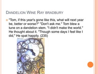 DANDELION WINE - FREE BOOK SUMMARY LITERATURE CRITICISM QUOTES - IMPORTANT QUOTATIONS Continued 12 Tom has an unexpected reply. DANDELION WINE - DOWNLOADABLE BOOK SUMMARY NOTES QUOTES - IMPORTANT QUOTATIONS Continued 8 The emphasis on the here-and-now on the immediate present is. Enjoy reading and share 14 famous quotes about Dandelion Wine Book with everyone.